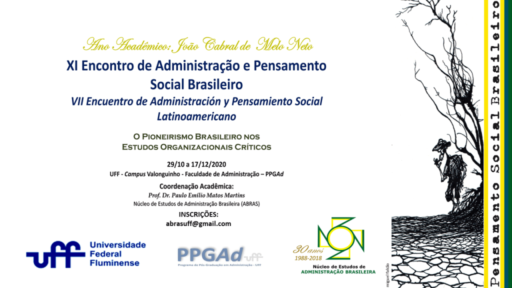 É com muita satisfação que divulgamos o XI ENCONTRO DE ADMINISTRAÇÃO E PENSAMENTO SOCIAL BRASILEIRO: O PIONEIRISMO BRASILEIRO NOS ESTUDOS ORGANIZACIONAIS CRÍTICOS, realizado pela UFF, e coordenada pelo Prof. Dr. Paulo Emílio Matos Martins.
