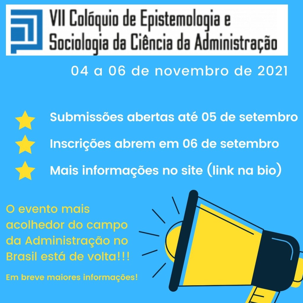 É com muita satisfação que anunciamos uma nova data para realização do VII COLÓQUIO DE EPISTEMOLOGIA E SOCIOLOGIA DA CIÊNCIA DA ADMINISTRAÇÃO, a ser realizado entre os dias 04 e 06 de novembro 2021, na modalidade online.