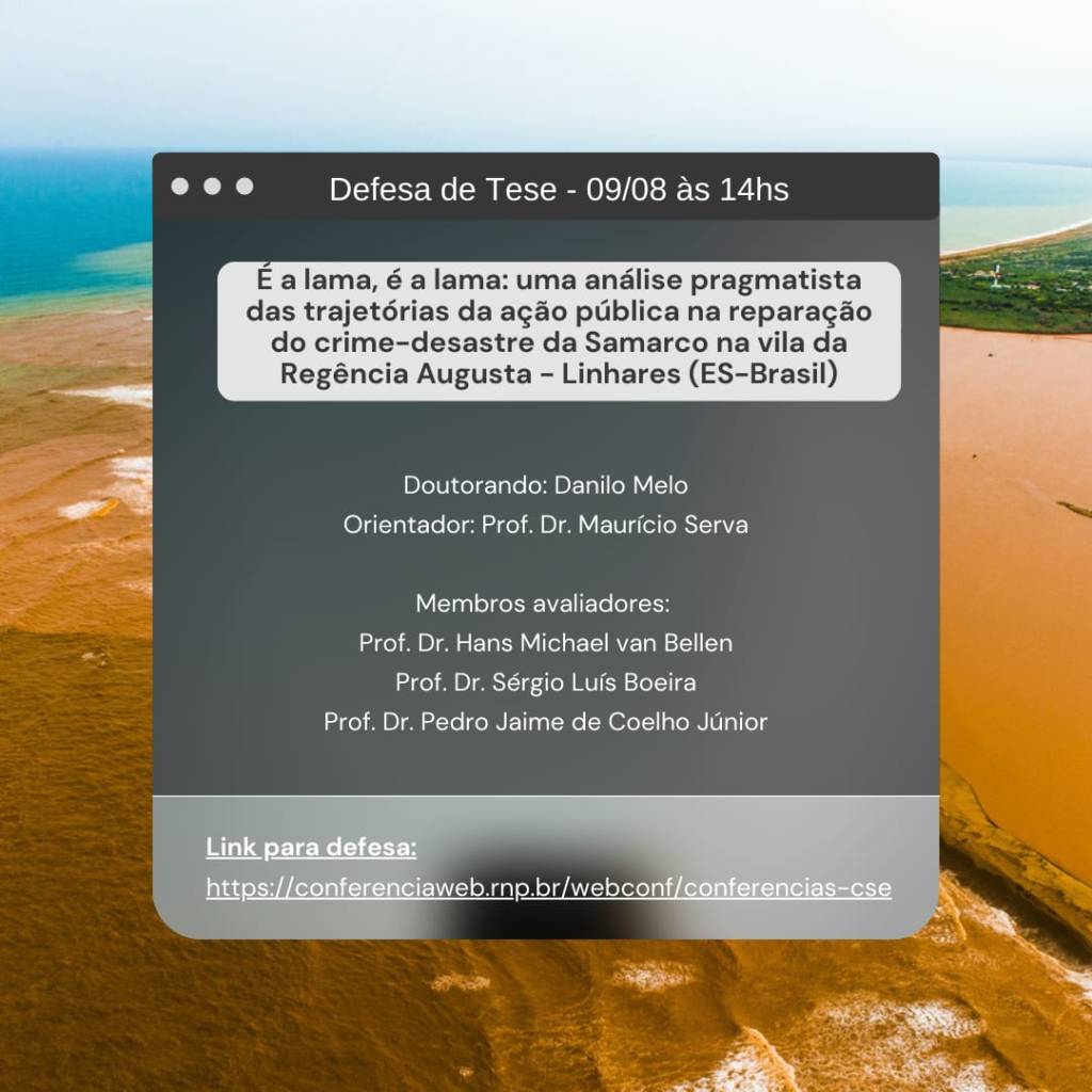 É com grande satisfação que convidamos para a banca de defesa da tese de Danilo Melo, membro do núcleo ORD, intitulada: “É a lama, é a lama: uma análise pragmatista das trajetórias da ação pública na reparação do crime-desastre da Samarco na vila da Regência Augusta – Linhares (ES-Brasil)”. O trabalho foi orientado pelo prof. Dr. Maurício Serva, e contará com os professores avaliadores: prof. Dr. Hans Michael Van Bellen, prof. Dr. Sérgio Luís Boeira, e prof. Dr. Pedro Jaime de Coelho Júnior.