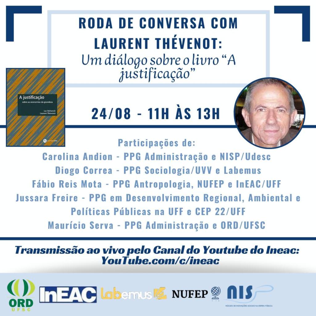 No próximo dia 24 de agosto de 2021, das 11h às 13h, será realizada uma Roda de Conversa com o professor Laurent Thévenot sobre o seu livro em parceria com o professor Luc Boltanski, intitulado: “A justificação: sobre as economias da grandeza”, cuja tradução foi recentemente publicada pela editora da UFRJ e traduzido por Alexandre Werneck.