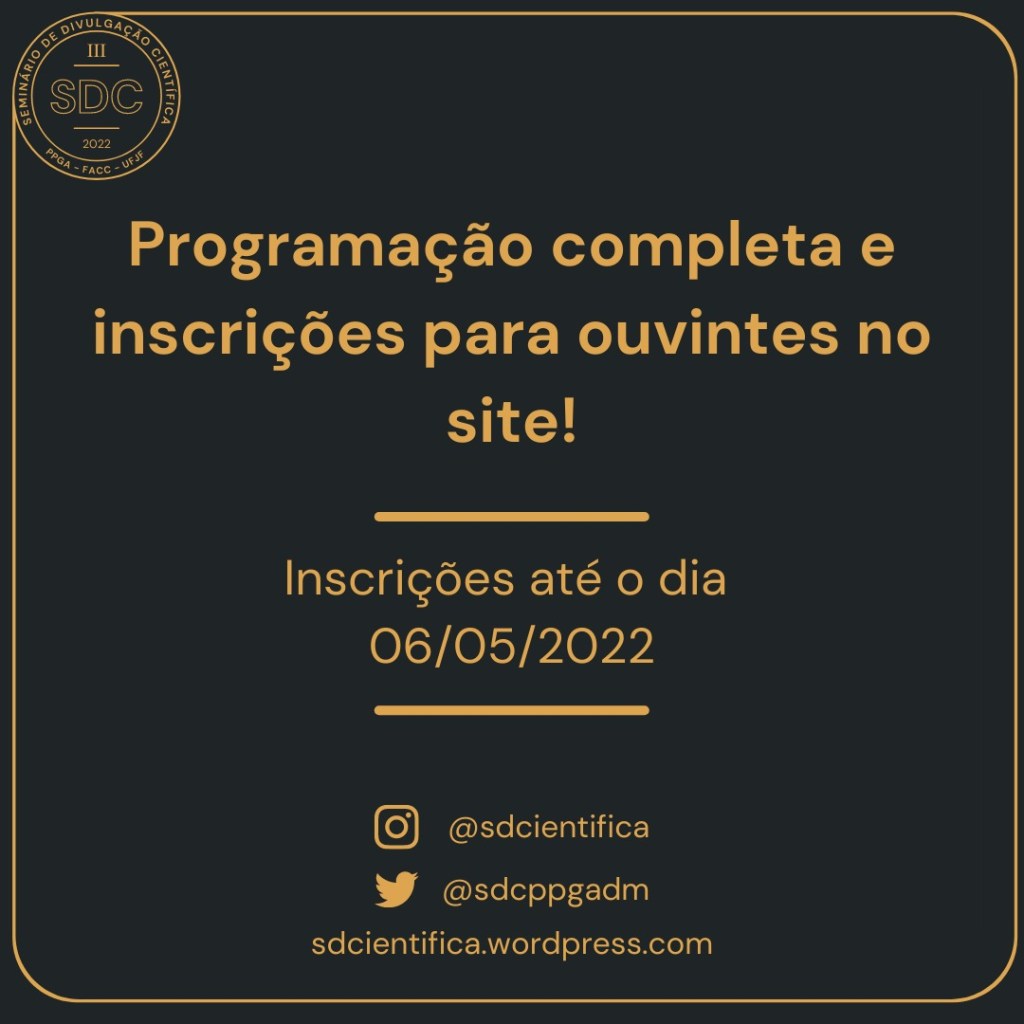 Estão abertas as inscrições de ouvinte para o III Seminário de Divulgação Científica do PPGAdm/UFJF, a ser realizado, preferencialmente no formato híbrido, entre os dias 16 a 20 de maio de 2022.