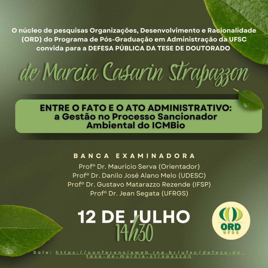 É com grande satisfação que convidamos para a banca de defesa da tese “ENTRE O FATO E O ATO ADMINISTRATIVO: a gestão no processo sancionador ambiental do ICMBio”, de autoria de Márcia Casarin Strapazzon, membra do núcleo ORD.