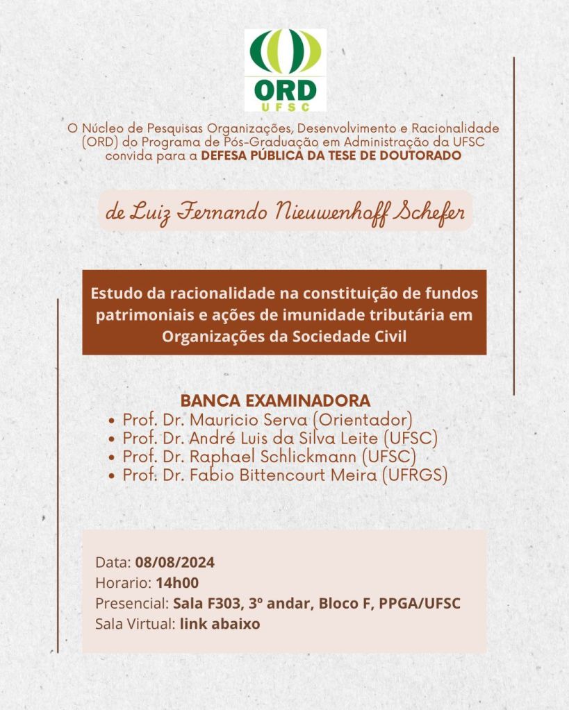É com grande satisfação que convidamos para a banca de defesa da tese “Estudo da racionalidade na constituição de fundos patrimoniais e ações de imunidade tributária em Organizações da Sociedade Civil”, de autoria de Luiz Fernando Nieuwenhoff Schefer, membro do núcleo ORD.